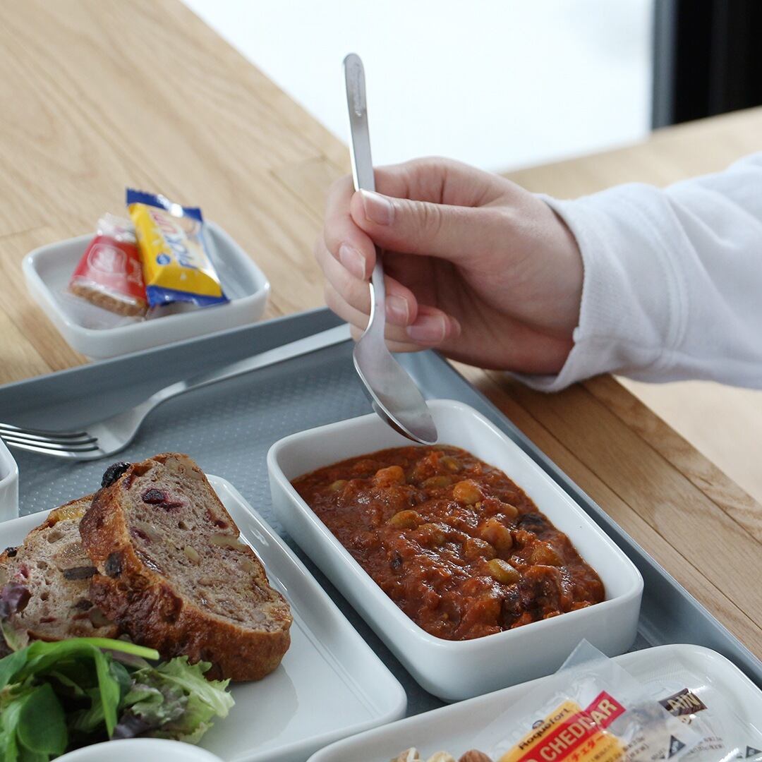 組み合わせ可能かつスタッキング出来る食器は、その自由性と高いデザイン性によりドイツの航空会社を始め様々な航空会社に採用され、機内サービスに用いられました。